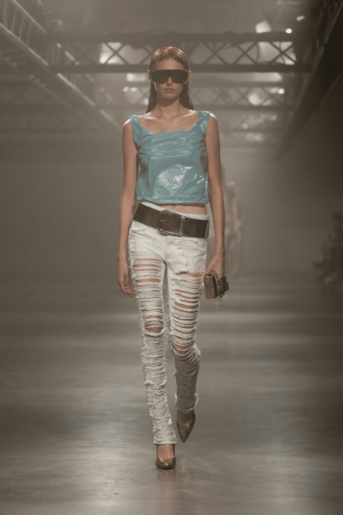 Denim trends go in extremes. While clean finishes continue to be fixture in collections for their versatility and enduring appeal, shredded denim is surfacing in directional collections by Off-White, MM6 Maison Margiela and Philipp Plein. Whether you call it punk, grunge, indie sleaze or brat, the thread-bare look instantly injects a dark and edgy vibe to slim and skinny jean fits.