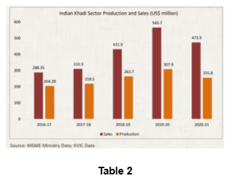 KVIC data. As compared to FY17, Indian Khadi sales increased by 13.2 percent between FY17 and FY21, reaching Rs. 3,527.7 crore ($473.9 million)