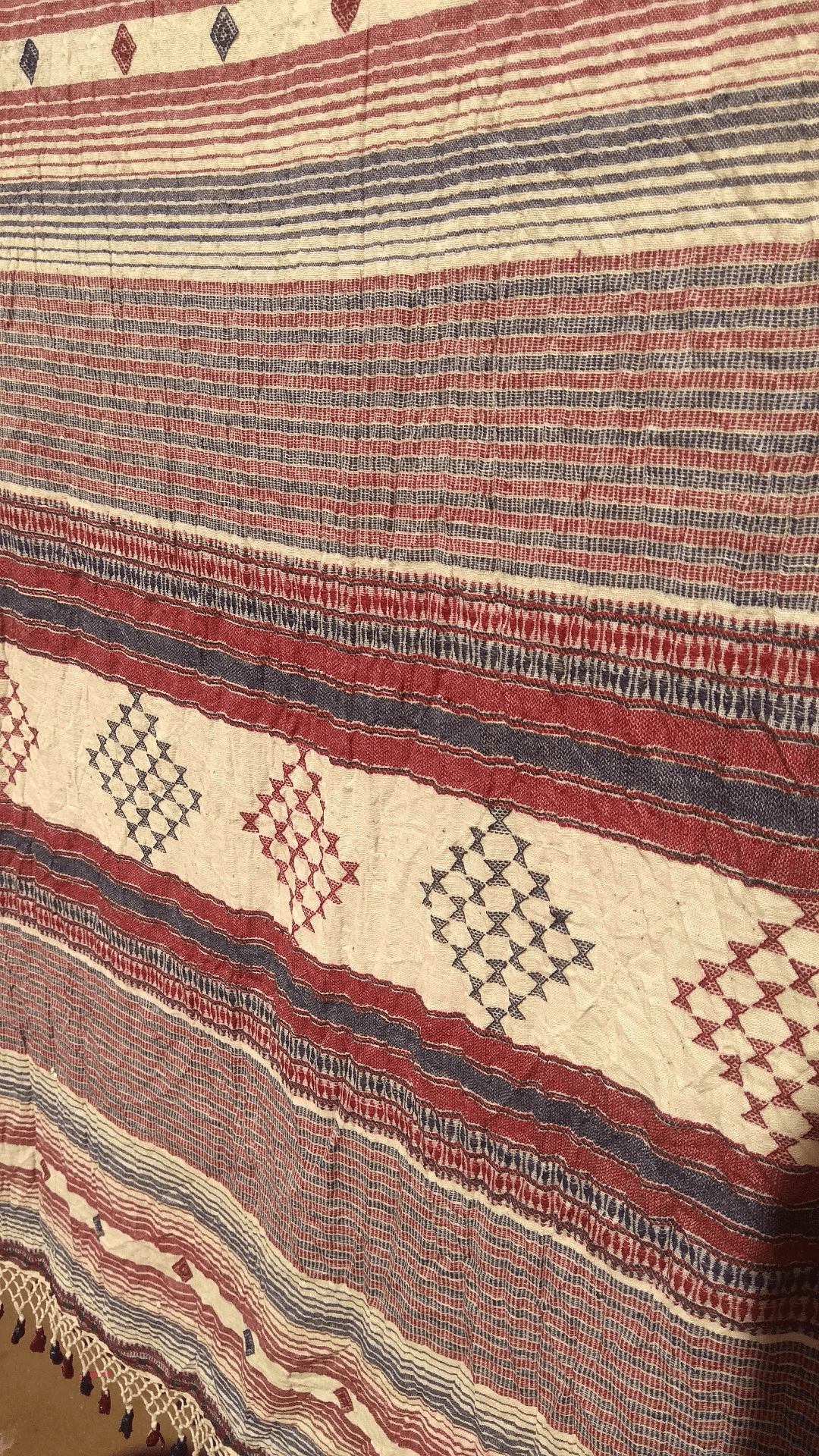 The end finishing of the shawls or smaller ones called stoles is done with colorful tassels, which is a distinctive feature of the bhujodi weaving.