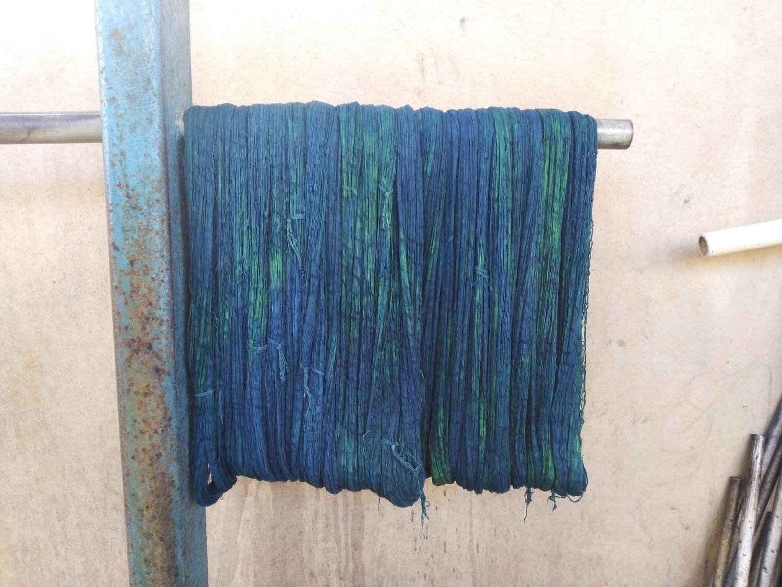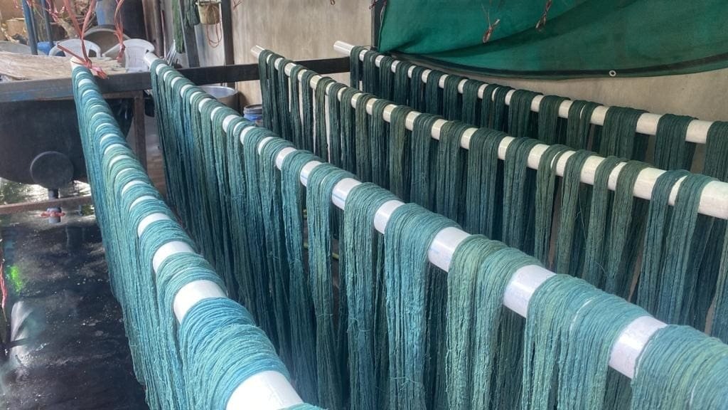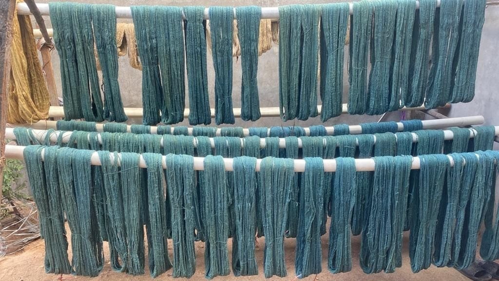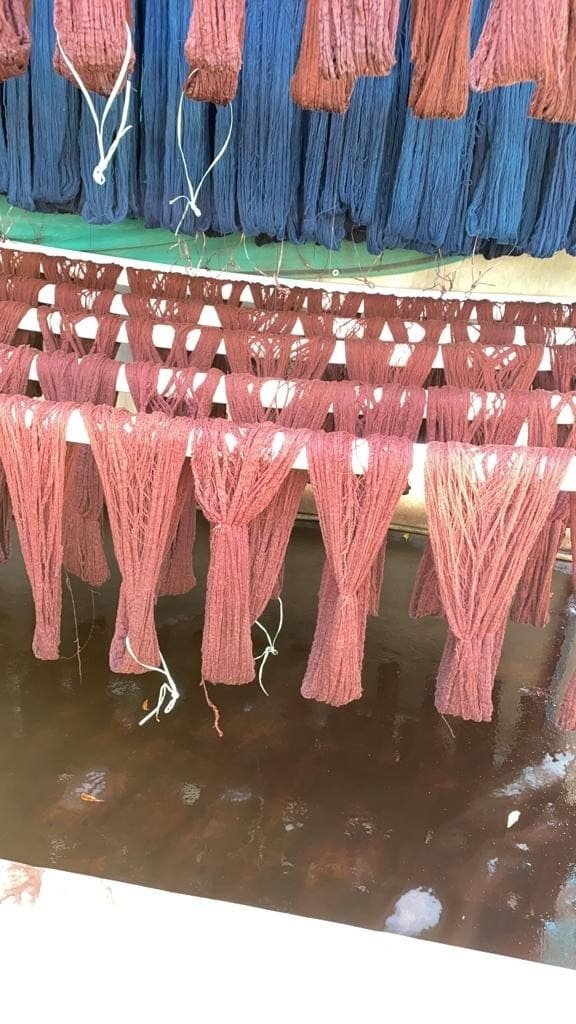 Their products are totally organic as they use locally grown kala cotton dyed with natural dyes. Cow Urine is used in the process while dyeing with Indigo. Indigo is purchased from natural dye sources, mainly from South India, Jaipur, or Ahmedabad. The price they pay for Indigo, for example, is Rs 11000 per kg. They have experienced adulteration with ash, lime, etc., when purchased from a few other sources, so they are confined to known sources only.
