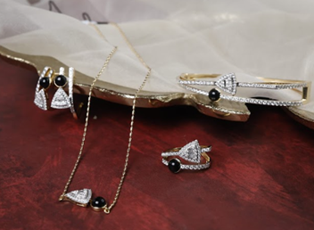 Yin and Yang Collection: A powerful balance of radiant diamonds and bold black onyx, across five refined gold-set pieces—ring, earrings, bracelet, Mangalsutra pendant—blending traditional themes with modern elegance.