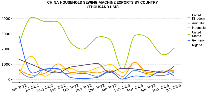 The United States (83K units), Indonesia (47K units) and Australia (30K units) were the main destinations of household sewing machine exports from China, together comprising 22% of total exports.