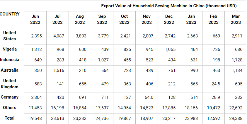 In value terms, household sewing machine exports soared to $24M (IndexBox estimates) in June 2023. Overall, total exports indicated a slight increase from June 2022 to June 2023: its value increased at an average monthly rate of +1.8% over the last twelve months. The trend pattern, however, indicated some noticeable fluctuations being recorded throughout the analyzed period. Based on June 2023 figures, exports decreased by -17.2% against March 2023 indices. The pace of growth appeared the most rapid in March 2023 when exports increased by 133% month-to-month. As a result, the exports attained the peak of $29M. From April 2023 to June 2023, the growth of the exports remained at a somewhat lower figure.