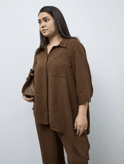 This dark brown blouse from Gia features an asymmetrical cut that adds subtle movement to your outfit. Made from breathable crinkle cotton, it comes with a shirt collar, concealed button-up front, three-quarter sleeves, and a front pocket. Style it with matching trousers or contrast separates for effortless everyday wear.