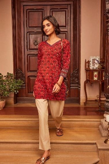 Bright and detailed, this crimson kurta is decorated with hand‑block printed motifs on soft cotton. A V-neck outlined in printed piping, echoed at the sleeve hems, unifies the design. With three-quarter sleeves and a fluid silhouette, it blends comfort with festive appeal. Ideal for casual evenings, family dinners, or seasonal celebrations—style it with neutral trousers, metallic sandals, and handcrafted jewelry.