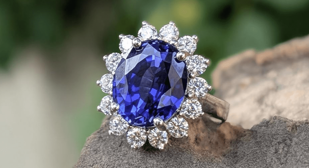 Featured piece: Princess Diana-inspired Angara Blue Sapphire Ring with Diamond Halo