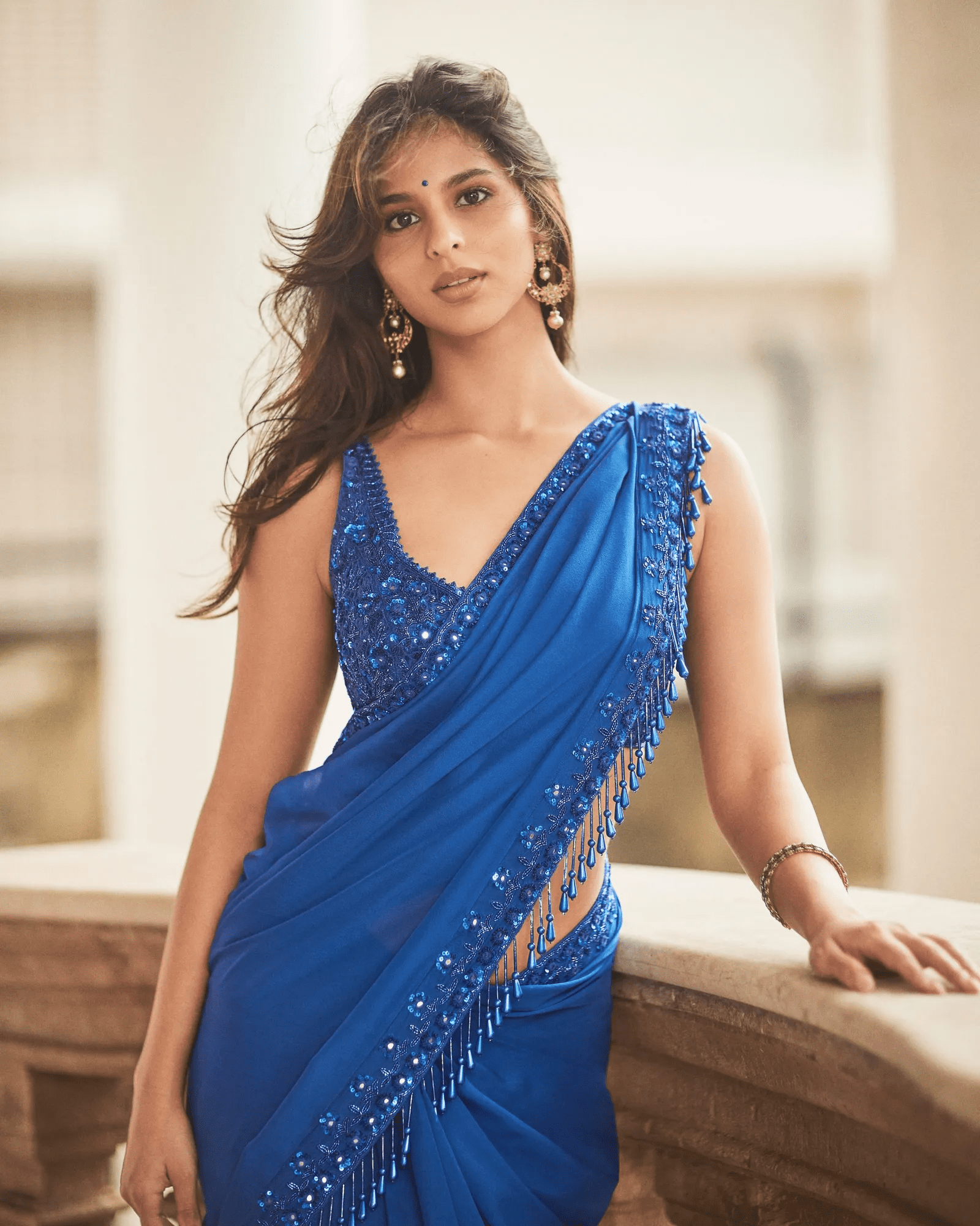 gave the classic drape a contemporary lift with an electric blue handwoven saree, detailed with mirror work and cutdana. Traditional polki earrings completed the modern-minimal look.