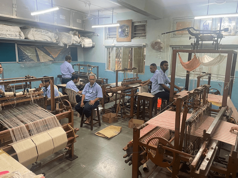 Bobbin filling is done by hand on hand charkha where big cotton bobbins weighing 3 kgs are converted to small lighter bobbins for weft. Warp is set manually on the looms. For weaving, Skill training is provided for 3 to 6 months on a pedal loom operated manually with legs. Shuttles are not passed by hand, but looms are adapted accordingly. Such looms have to be free of the use of any electricity or automation to prevent any risk to the beneficiaries.