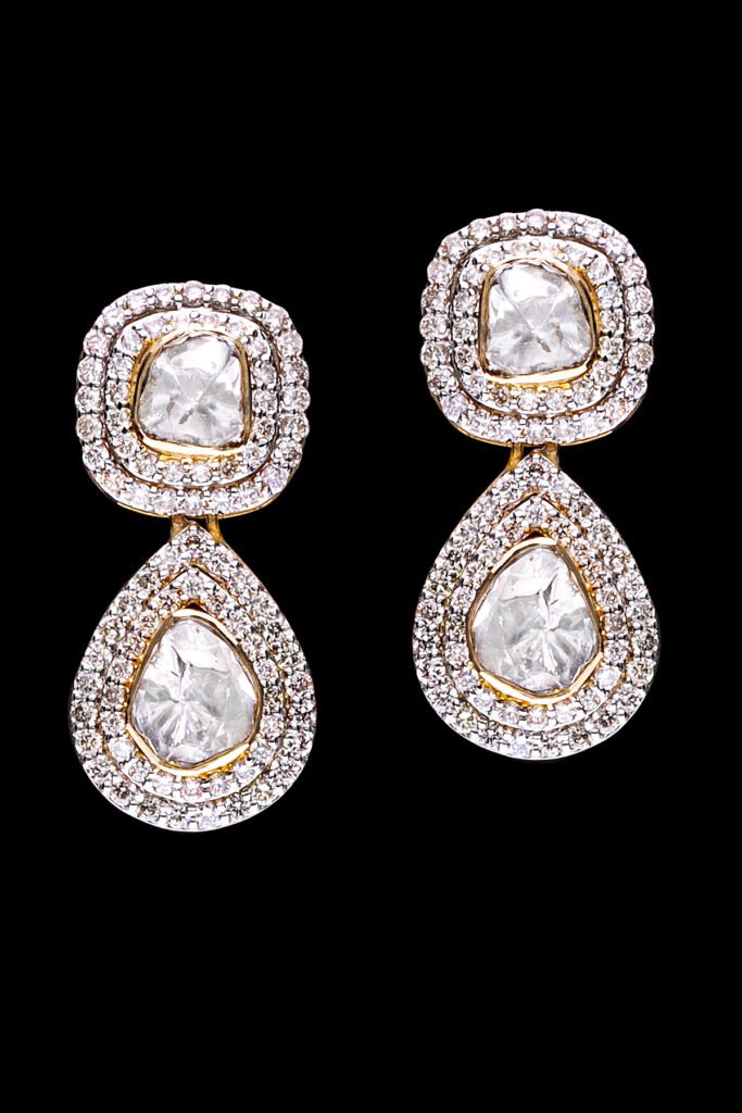 4. Polki Earrings: These delicate Polki Earrings, crafted with uncut polki diamonds and brilliant cut diamonds, set in 18kt gold, exude a luxurious charm while ensuring durability and longevity. The combination of uncut polki diamonds and brilliant cut diamonds creates a captivating look, adding depth and dimension to the design. These earrings are versatile and chic for casual and formal occasions. Whether worn with a simple blouse for a touch of everyday glamour or paired with an elegant gown for a special event, the Polki Earrings effortlessly elevate any ensemble.