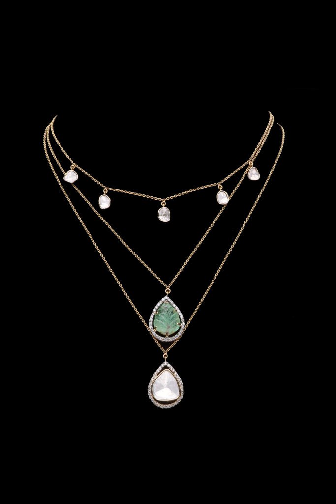 3. Multi-Layered Russian Emerald and Polki Pendant: This Multi-Layered Russian Emerald and Polki Pendant is crafted with uncut polki diamonds and brilliant cut diamonds. The pendant exudes a timeless allure, capturing these precious stones’ natural beauty and radiance. Moreover, including a carved Russian emerald adds a touch of exotic charm and sophistication to the design. The intricate carving of the emerald enhances its allure, creating a mesmerising focal point that commands attention. Crafted in 18kt gold, the pendant radiates luxury and refinement while ensuring durability and longevity. Its multi-layered design adds depth and dimension, creating a visually stunning piece that will turn heads. Whether worn alone as a statement piece or paired with earrings for a more dramatic look, the Multi-Layered Russian Emerald and Polki Pendant is a true expression of individuality and style. Perfect for formal occasions and everyday wear, this pendant will surely become a cherished addition to any jewellery collection.