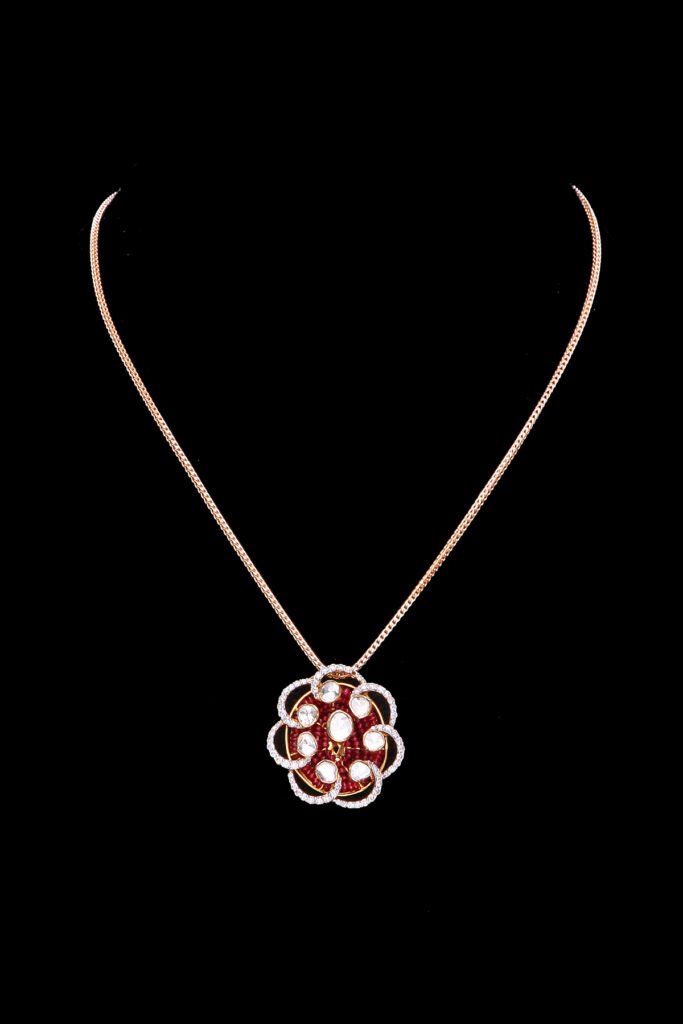 2. Minimal Ruby Pendant: The Minimal Ruby Pendant embodies simplicity and elegance, offering a contemporary take on traditional Indian jewellery. They are crafted with uncut polki diamonds, brilliant cut diamonds, and the inclusion of ruby beads, adding a subtle yet striking pop of colour and character to the design. The rich hue of the rubies enhances the pendant’s allure, creating a captivating focal point that draws the eye. Crafted in 18kt gold, the pendant exudes a luxurious elegance, ensuring durability and longevity. Its minimalist design makes it versatile and easy to pair with various outfits, from casual ensembles to formal attire.