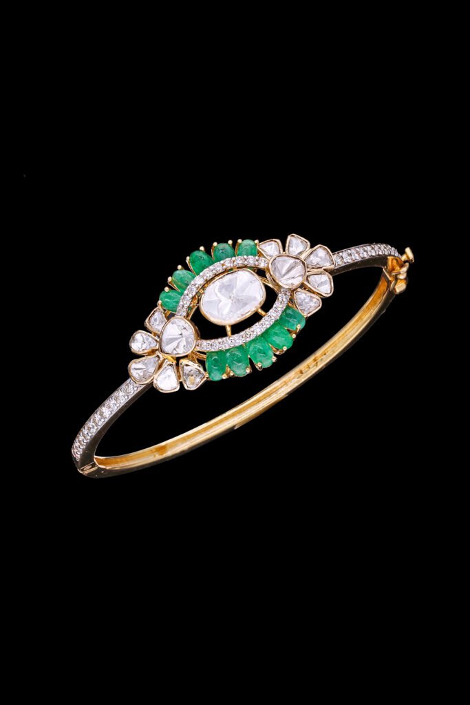 1. Emerald Polki Bracelet: The Emerald Polki Bracelet epitomises the essence of traditional Indian jewellery with a contemporary twist. Crafted with uncut polki diamonds, this bracelet captures these precious stones’ raw beauty and natural allure. The brilliant cut diamonds adorning the piece add a touch of sparkle and sophistication, contrasting beautifully with the rustic charm of the polki.