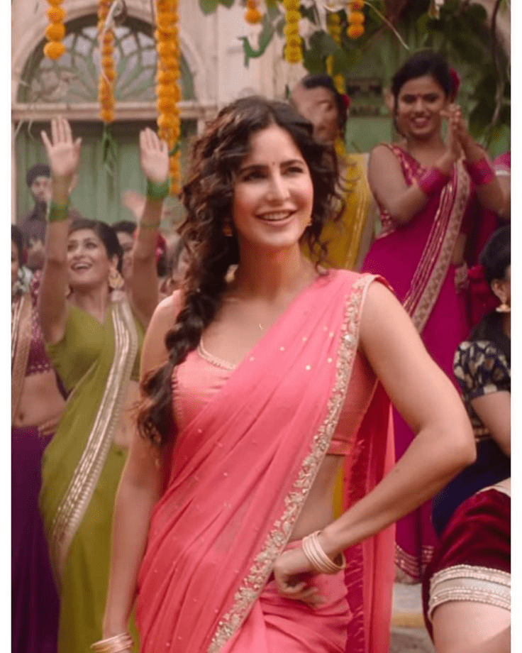 A lesson in understated elegance, Katrina’s soft pink saree in Bharat became a go-to visual for modern minimalism. Its pastel shade, paired with loose waves and muted makeup, reflected her character’s quiet strength.