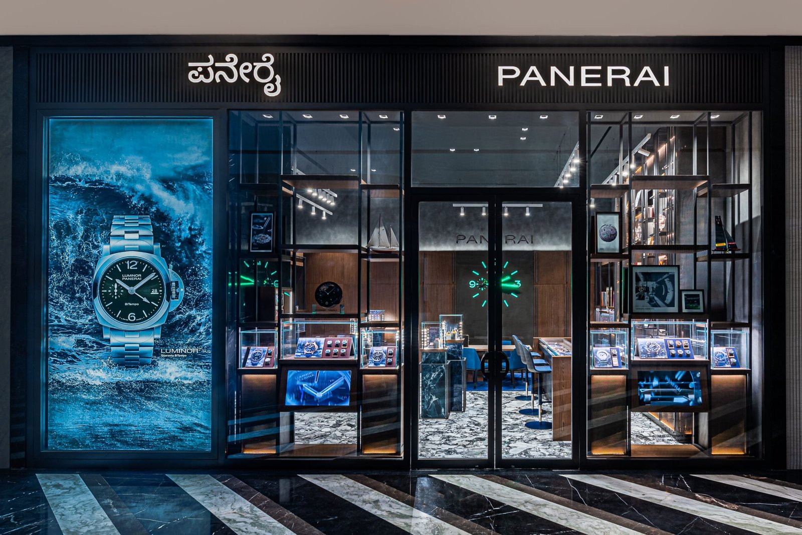 Upon arrival, visitors are greeted by the bold and distinctive Panerai logo alongside the brand’s signature luminescent clock, retro-illuminated to reflect the Super-Luminova® fluorescence, a signature feature of all Panerai timepieces. This fully operational timepiece, prominently placed for high visibility, serves as a testament to the brand’s deep-rooted expertise in luminescence.