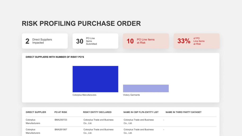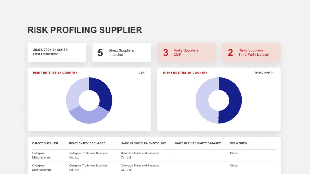 The data is proactively screened for risk against the U.S. Customs and Border Protection (CBP) entity list, and the solution can integrate with any relevant risk screening database.