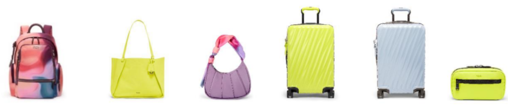 (L to R): Voyageur Celina Backpack in Sentosa Sunset, Georgica Valorie Tote in Acid Green, ASRA Shoulder Bag in Purple/Sunset, 19 Degree International Expandable 4 Wheeled Carry-On in Acid Green and Halogen Blue, and TUMI Zip-Around Case in Acid Green