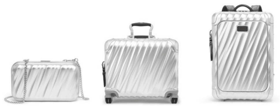 (L to R): 19 Degree Aluminum Minaudiere, Compact Carry-On and Backpack in Silver